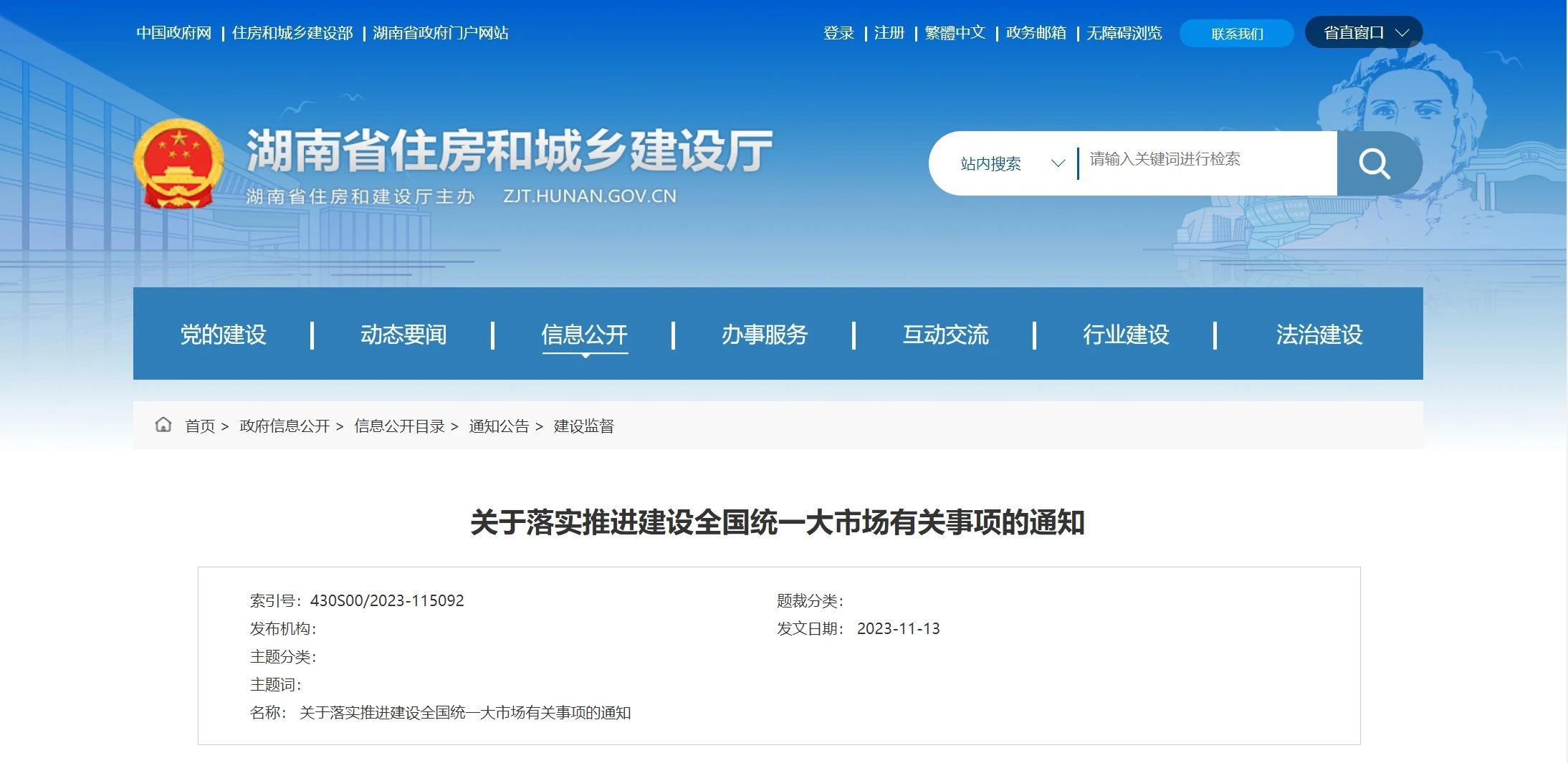 11月13日,湖南省住房和城乡建设厅发布《湖南省住房和城乡建设厅关于落实推进建设全国统一大市场有关事项的通知》。具体内容如下: